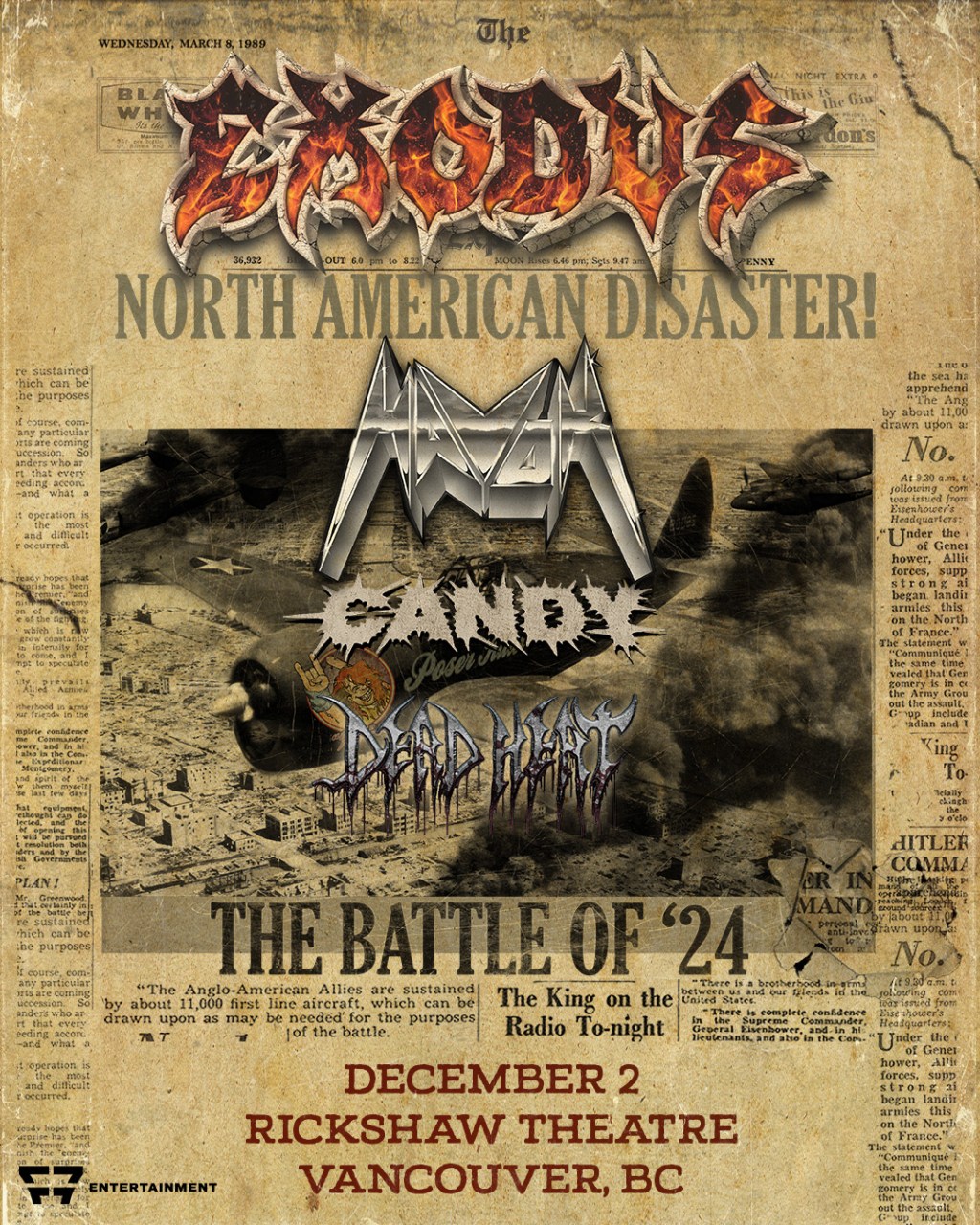 EXODUS Where The Rickshaw Theatre, Vancouver Map When Dec 02/24 12:00 AM - Dec 02/24 11:00 PM Age 19+ Website https://www.ticketweb.ca/event/exodus-presented-by-rickshaw-theatre-tickets/13716963?pl=F7entertainment F7 ENTERTAINMENT PRESENTS: EXODUS With special guests: Havok, Candy and Dead Heat The Rickshaw Theatre – December 2nd, 2024 – 19+ – Tickets here