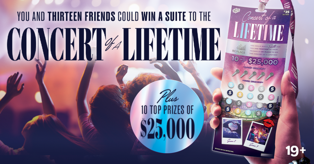 BC Lottery is excited to launch a limited-run Scratch & Win ticket, with the prize of a lifetime – a suite for 14 people (including food & bev) at BC Place to see one of the world’s biggest artists in concert this year.