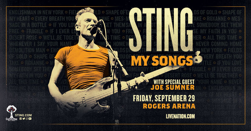 Sting When Sep 29/23 06:00 PM - Sep 29/23 10:00 PM Age All Live Nation presents: Sting – My Songs September 29th at Rogers Arena with guest Joe Sumner On sale is: Friday, April 14 at 10am
