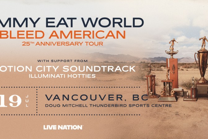 Doug Mitchell Thunderbird Sports Centre Live Nation presents Jimmy Eat World | Bleed American 25th Anniversary Tour Sunday, July 19, 2026 | Doug Mitchell Thunderbird Sports Centre Tickets on sale Friday, Feb. 13 @ 10am Ticketmaster.ca